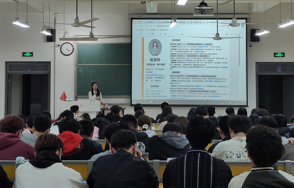 吴亚玲以“在探索中找到职业热爱”为题,从大学成长规划、职业选择和求职准备等方面进行了分享,向同学们介绍了自己大学期间的个人经历和成长经验,分享了自身在进行职业目标探索的过程和感受,传授了简历撰写与修改、面试语言表达等方面的经验和技巧。吴亚玲还鼓励大家从自身能力出发,坚持心中的热爱,拓宽就业渠道,明确就业的目标和方向,以更加积极的态度和方式面对大学生活和职业选择。