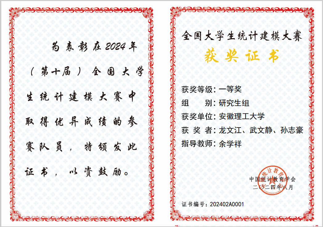 近日,2024年(第十届)全国大学生统计建模大赛决赛答辩在陕西西安落幕,自开赛以来,全国共有802所院校,21386支队伍,64158名大学生参赛,经过校赛、省赛、国赛通讯评审、现场会议评审,共评出100支队伍入围国赛答辩赛环节。365英国上市网站官网参赛队伍最终获得全国一等奖一项、省级二等奖一项,创造了365英国官网在该赛事上国奖的零的突破。国奖团队由学院余学祥教授带队指导,成员由研究生龙文江、武文静、孙志豪组成。