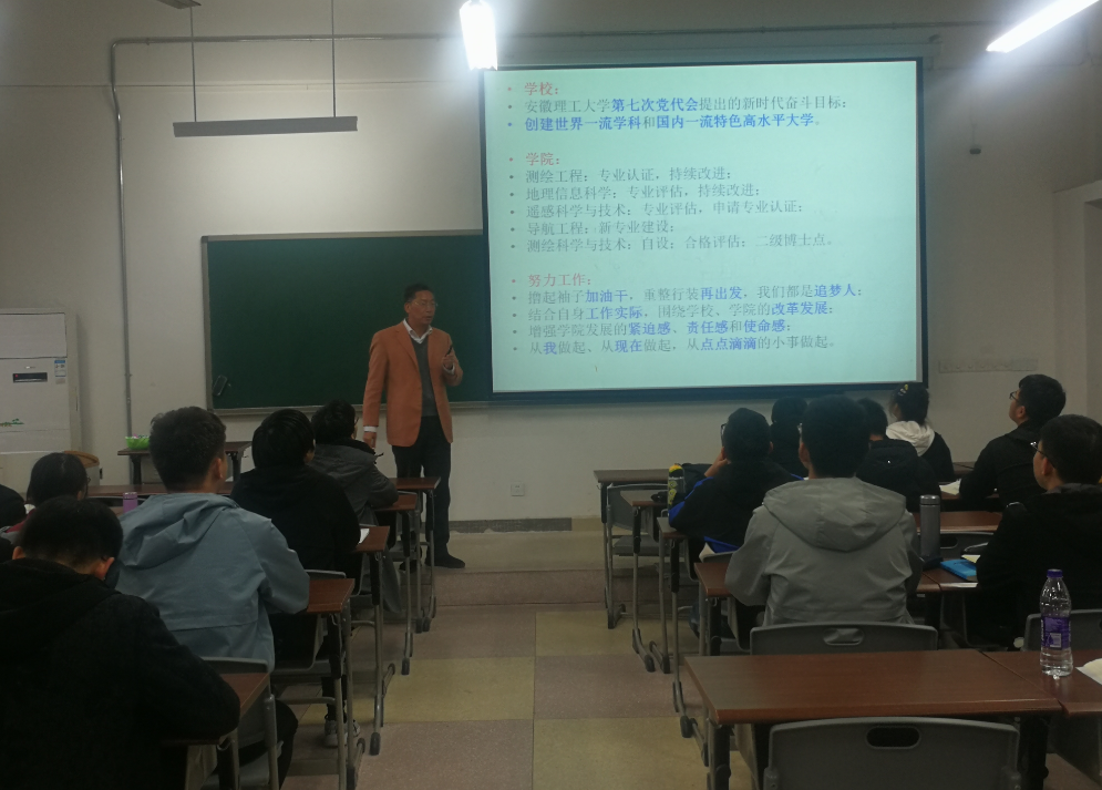 11月19日下午,365英国上市网站官网党委副书记院长赵志根在天工南309教室为地理信息科学2018-1班同学讲党课。