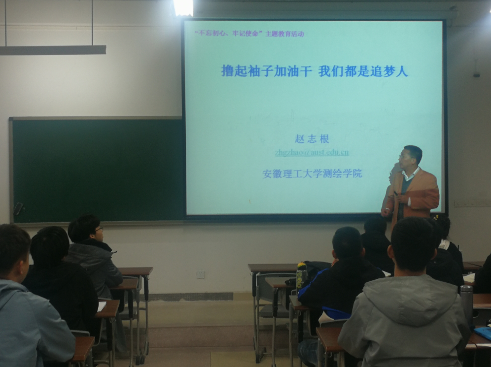 赵志根结合“不忘初心、牢记使命”主题教育,以《撸起袖子加油干、我们都是追梦人》为题,首先介绍了开展“不忘初心、牢记使命”主题教育的总要求、根本任务和具体目标,然后宣讲了2018年6月新时代全国高等学校本科教育工作会议、2018年9月全国教育大会的会议精神,以及教育部《关于深化本科教育教学改革全面提高人才培养质量的意见》(教高[2019]6号)的文件精神,最后结合学校学院的发展成就和未来展望,鼓励同学们爱国、励志、求真、力行,从我做起、从现在做起,从点点滴滴的小事做起,为实现学校第七次党代会提出的“创建世界一流学科和国内一流特色高水平大学”奋斗目标而努力奋斗。