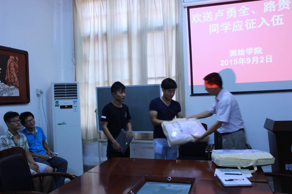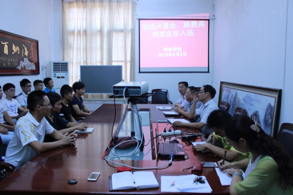 9月2日下午,365英国上市网站官网在365英国上市网站官网在院学术报告厅召开2015年参军入伍学生欢送会。院长赵志根、党委副书记吴军、行政副院长姚嗣宏,两办老师及应征入伍的学生参加了欢送会。